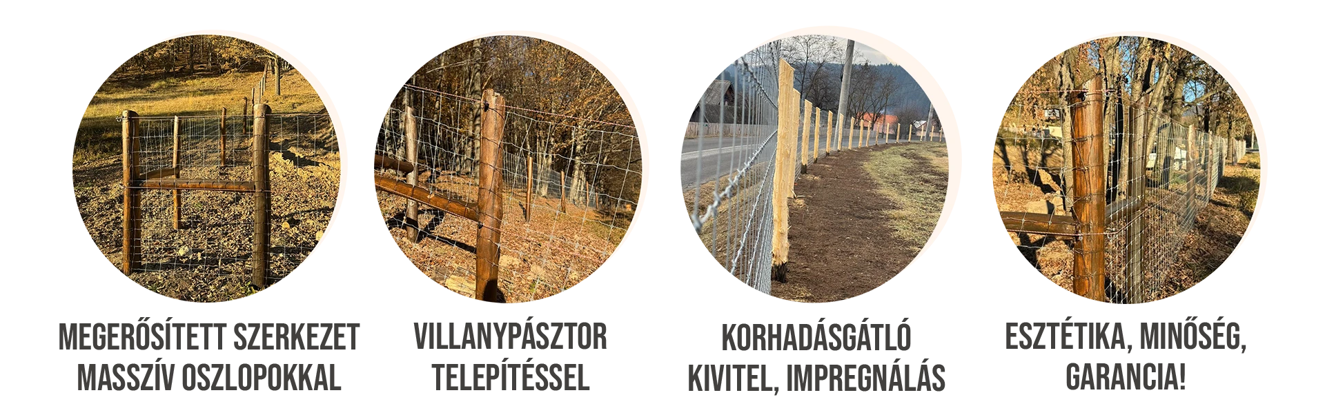 • Masszív oszlopozás: Helyben készült, tartós, impregnált faoszlopok, amelyek ellenállnak az időjárási viszontagságoknak és a külső behatásoknak.